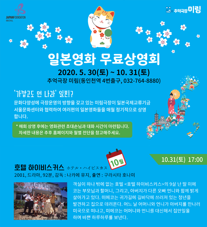 10월31일(토) 일본무비 컬렉션 정기상영회 페이지 정보 작성자 미림극장 작성일20-05-12 10:46 조회3,277회 댓글0건 목록 본문 * 매 상영 후 영화와 일본문화에 대해 폭넓게 이야기해보는 관객과의 대화가 진행됩니다. 5월 초대손님 : 고미네 아키라(전 부천한일문화교류회장, 전 유니버셜 재팬 한국소장)6월 초대손님 : 김량 감독(영화 바다로 가자)8월 초대손님 : <강아지 마메시바> 상영 후 이희섭 감독 (영화 <고양이 집사> 등) / 모더레이터 : 심현빈 관장(영화공간주안) <아무도 지켜주지 않아> 상영 후 백재호 감독 (영화 <대관람차> 등) 9월 초대손님 : 김진유 감독(영화 <나는 보리>)10월 초대손님 : 정승오 감독(영화 <이장>) 댓글목록 등록된 댓글이 없습니다. 목록