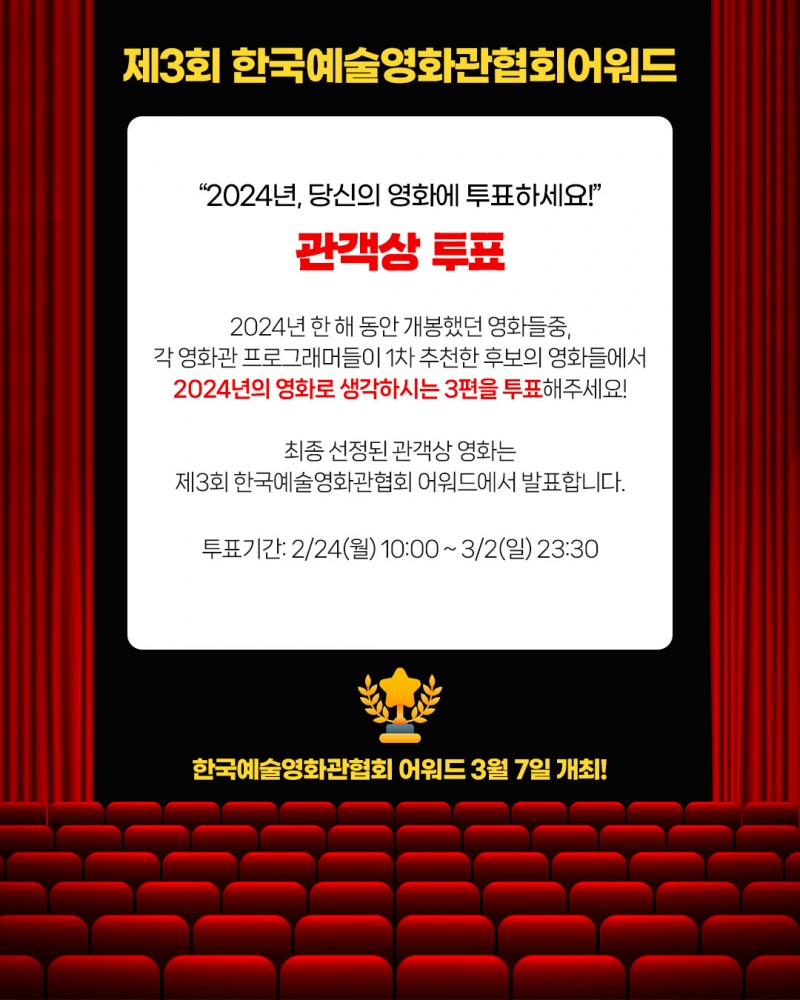 상단 투표 링크를 통해 2/24(월)~3/2(일) 기간동안 투표에 참여하실 수 있습니다! 최종 선정된 영화는 3/7(금) 제3회 한국예술영화관협회 어워드에서 발표합니다.