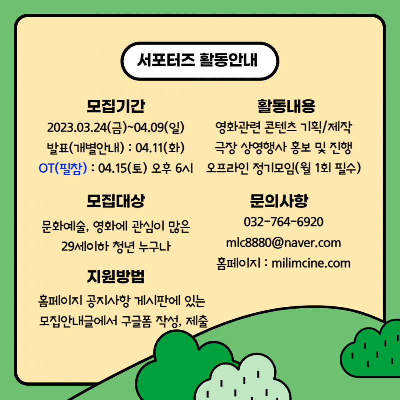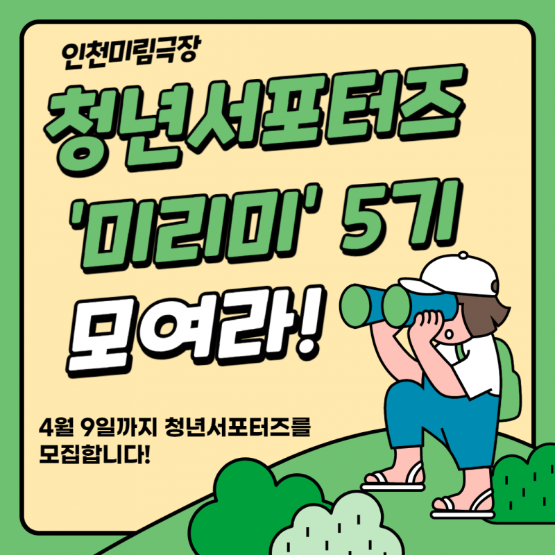 미림극장 청년 서포터즈 미리미5기를 모집합니다!! 페이지 정보 작성자 미림극장 작성일23-03-24 16:30 조회673회 댓글0건 목록 본문 미리미5기 지원하러가기!* 활동기간은 5월(OT이후)부터 12월까지입니다.* 활동종료 후 문화품앗이(문화체육자원봉사시스템)를 통해 봉사시간 부여하며 1365와 연동됩니다. 댓글목록 등록된 댓글이 없습니다. 목록