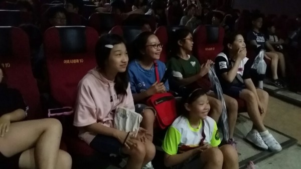 빗 속을 둟고 이웃에 있는 송림 초등학교 4,5,6 학년 학생들 225명이 단체 관람을 왔어요.