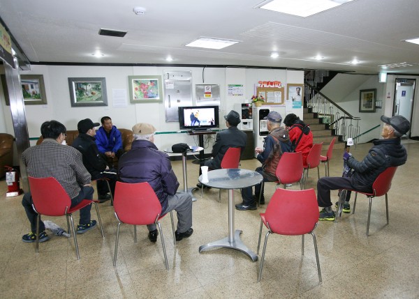 영화가 끝난 후 휴계실에서 TV를 시청하며 휴식을 취하시는 어르신들